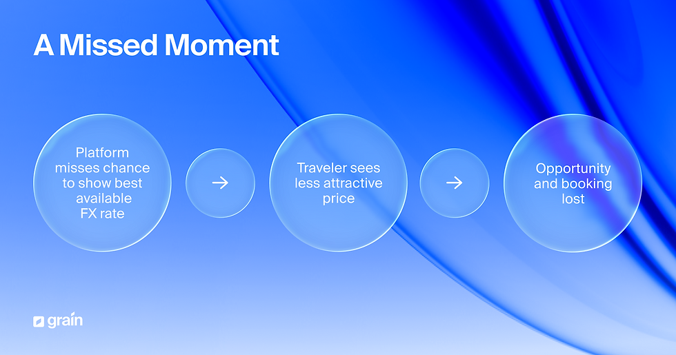 Most platforms still refresh FX once per day. By the time a traveler reaches checkout, that rate is already outdated. Even small intraday currency moves can make a price feel slightly worse than expected. In competitive booking flows, that hesitation is all it takes to lose the sale.
